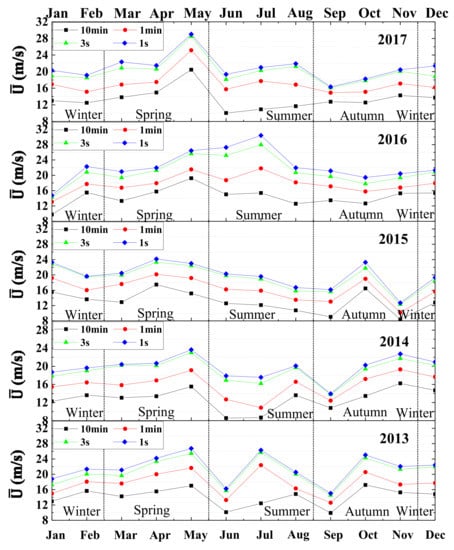The data recorded in the period from 2013 to 2017 by the 140 m anemometer installed on the Beijing meteorological tower were used to preliminarily evaluate the local statistical properties of the wind speed in order to avoid the interference of the airflow around the meteorological tower due to the complex urban surroundings. Accordingly, as shown in Figure 5, the distribution of the monthly maximum mean wind speeds in 1-s, 3-s, 1-min and 10-min time intervals for the 5 years extracted from this anemometer are presented. In spring, the peak value of the monthly maximum average wind speed averaged on different time intervals generally appeared in May, and only in 2015 did it occur in April, in correspondence with an intense sandstorm. Then, the mean wind speed presents an obvious decrease in summer. Of particular interest is the summer in 2016. After the investigation, a short intense gust front in June and a thunderstorm in July happened and were detected, which made clear the mean wind speed increasing in short intervals. The monthly maximum average wind speed related to September is relatively smaller, and presents a peak in October or November in autumn. In winter, the monthly maximum average wind speed is generally homogeneous. The abnormal small values in November 2015 and January 2016 probably derive from the lack of valid data due to equipment failure. The annual variation is because of Beijing’s closer proximity to the wind source in the spring and winter months [36]. The analysis results are also consistent with the characteristics of the temperate continental monsoon climate in Beijing [37].
