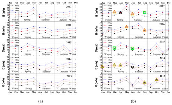 Distribution of the monthly maximum wind speed with time intervals of 10 min (a) and 3 s (b) from 2013–2017. Orange triangles: the trend lines related to 140 m and 280 m are very close; green squares: the gust wind speed at the height of 140 m even exceeds the wind speed at the height of 280 m. Black circles: the maximum gust wind speeds at the height of 47 m and 140 m are very close.
