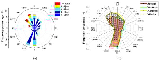 As for the analysis of the mean wind directions, the relevant horizontal wind rose is first presented in Figure 7a based on the 5-year data detected by the 140 m anemometer. It shows that the dominant wind directions are northwest, north, southwest and south. The samples of high wind speeds in the northwest and low wind speeds in the south are relatively numerous, while the samples for the other directions are relatively sparse. The seasonal distribution of the wind direction is illustrated in Figure 7b, which shows that the northwest wind prevails in winter and the southwest wind is dominant in summer. Spring and autumn are the transition seasons, and south, southwest and northwest are the dominant wind directions.