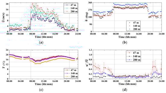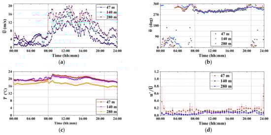 Time histories of the synoptic event which occured on 10 October 2013, related to the heights of 47 m, 140 m and 280 m: (a) 10-min mean wind speed, (b) 10-min mean wind direction, (c) 10-min mean temperature, and (d) the friction velocity normalized by the mean wind speed . The vertical dashed lines include the time window of the event.