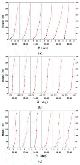 The profile variations of the 10-min mean wind speed (a), horizontal direction (b) and wind angle of attack (c) (namely the angle between the wind flow direction and the horizontal direction) every two hours are shown in Figure 10. A regular variation trend occurs during the strong storm. The vertical angle changed slightly at low heights and remained almost constant at higher levels.
