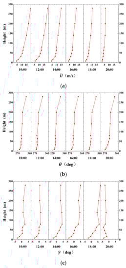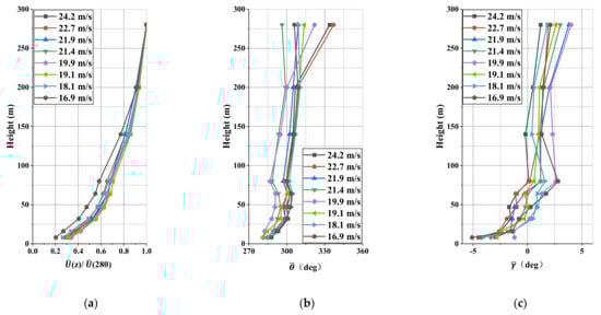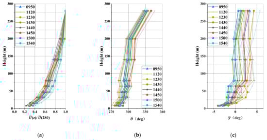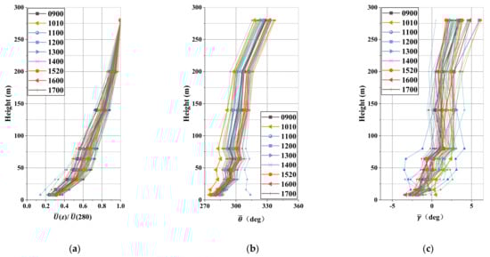 The profiles of normalized with reference to the value at 280 m (a), the horizontal direction (b) and the wind angle of attack (c) are shown in Figure 14. The wind speed profiles of the different 10-min length segments present a relatively similar trend to the height. This property is more prominent for the wind direction, which rotates clockwise a little. As far as concerns the angle of attack, most of the values lower than 64 m are negative. They then become relatively constant until 200 m. It is noteworthy that there is a slight increase between the heights of 200 m and 280 m.