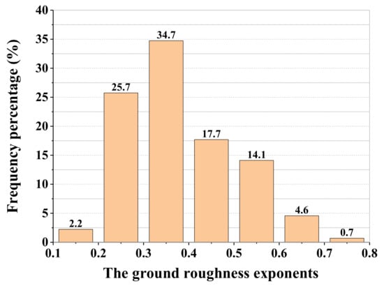 Here, the distribution of the ground roughness exponents obtained from all of the considered intense records with 10-min mean wind speeds faster than 11 m/s related to the 140 m anemometer by regression analysis is presented in Figure 16. Accordingly, it can be found that most of the results, namely 60.4%, are between 0.2 and 0.4. Then, the profiles are separated into five different families with different wind speed ranges at 140 m height: 11 12, 12 13, 13 14, 14 15, and 15 21 m/s. The fitting ground roughness exponents of every record belonging to the same family are averaged and illustrated in Table 5, below. As the mean wind speed of the records considered increases, the ground roughness exponent decreases gradually. All of the average fitting exponents are larger than the maximum value in the Chinese National Load Code ( = 0.30 for terrain D). On the other hand, based on the code, the ground roughness exponent around the tower is 0.22 (terrain C), a value lower than the results from the measured data [31].