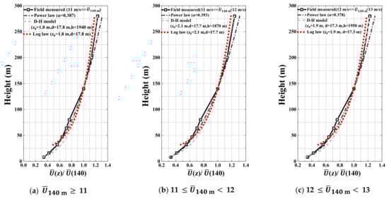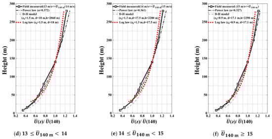 The measured profiles which are the ensemble-averaged values of the 10-min mean wind speed for the whole family considered (a) and several regimes of the reference wind speed at 140 m AGL ((b)–(f)) are compared with the empirical mean speed profiles which were determined based on the aerodynamic parameters fitted by the corresponding measurement in Figure 17. All of the profiles were normalized at the 140 m value. The average values of at 80 m, where the maximum occurs in the near-surface layer, were applied in these models [11,46]. The concept of a local value depending on height above the ground was also used by Burlando et al. [47] with reference to complex terrains.