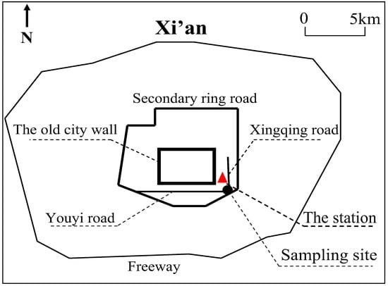 Daily PM2.5 samples were collected on the roof top of a five-storied building (16.3 m above the ground) on the campus of Xi’an Jiaotong University (108.990° E, 34.252° N) that is surrounded by residential areas and other campus buildings, and is approximately 200 m away from the Xingqing Road and South Second Ring Road (Figure 2), which have heavy traffic, making it a suitable region with a mixture of mobile emission and stationary emission sources. Twenty-four-hour PM2.5 samples (10:00 am to 10:00 am next day local time) were collected using pre-fired (780 °C, 3 h) 90 mm PALLFLEX TISSUQUARTZ filters (QM/A, PALL, Ann Arbor, MI, USA) with the HY–100SFB high-load PM sampler at a flow rate of 100 L min−1 from 1 January 2020 to 7 March 2020. A total of 67 PM2.5 samples and 3 field blank filters (1 for each period) were collected in this study. The final data were obtained by subtracting all field blanks to avoid any artifacts induced by gas absorption.