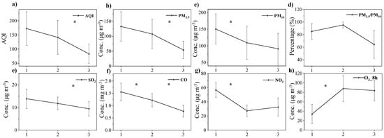 Variations in (a) AQI; (b) PM2.5 concentration; (c) PM10 concentration; (d) ratios of PM2.5/PM10; (e) SO2 concentration; (f) CO concentration; (g) NO2 concentration; (h) O3_8h concentration in different periods of COVID-19 lockdown (1: pre-lockdown, 2: during lockdown, 3: post-lockdown. The asterisk (*) represents the difference was statistically significant).