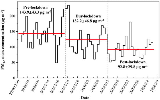 Time series of PM2.5 mass concentrations in offline samples during the different periods of COVID-19 lockdown. The red lines represent the average values of PM2.5 mass concentration.