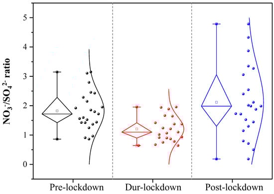 From the perspective of the percentage of individual to the total ion concentration, only the percentages of NO3− and SO42− exhibited greater changes in the periods of pre-, during, and post-lockdown. The proportion of NO3− in total WSIs was the lowest during the lockdown, with the value of only 36.7%, which was 15.8% and 24.3% lower than that before and after the lockdown. The proportion of SO42− was the highest during the lockdown, reaching 31.6%, which was 17.5% and 47.6% higher than that before and after the lockdown. NO3−/SO42− ratio has been usually used as a relative measure of the importance of motor mobile sources versus stationary emission sources (such as emissions from industrial combustion and residential fuel combustion) in many studies [10,77]. Figure 5 presents the NO3−/SO42− ratios in the pre-lockdown, during lockdown, and post-lockdown periods in 2020. The NO3−/SO42− ratios during the lockdown (average: 1.2 ± 0.4, range: 0.6–2.0) were considerably lower and less distributed than those in the periods of pre-lockdown (average: 1.8 ± 0.6, range: 0.9–3.1) and post-lockdown (average: 2.1 ± 1.2, range: 0.2–4.8). Elevated NO3−/SO42− ratios in the periods of pre- and post-lockdown implied stronger influences from motor vehicles, consistent with the drastic drop in traffic volume and sharp rise of NO2 during the lockdown. The decreased ratio of NO3−/SO42− during the lockdown indicated that residential combustion sources (for heating in the cold winter) increased significantly in the context of reduced traffic (mobile source) and industrial combustion sources (coal-fired industrial plants).