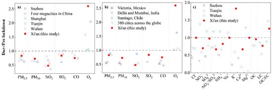 Comparison of during lockdown/pre-lockdown of national controlled air pollutants (a) between Xi’an and domestic cities; (b) between Xi’an and foreign cities, and (c) during lockdown/pre-lockdown of PM2.5 chemical species between Xi’an and domestic cities.