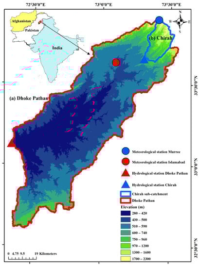 This study is conducted over two sub catchments of the Soan River Basin (SRB), namely Chirah and Dhoke Pathan (Figure 1), which have a drainage area of 336 km2 and 6542 km2, respectively. The Soan River has a length of 272 km, and rocks of tertiary age prevail in most of the basin [], whose elevation ranges from 264 masl to 2274 masl (Figure 1). The climate of this region is categorized as “Sub-tropical Triple Season Moderate Climate Zone”. On average, the temperature is 13.2 °C (17.6 °C), the annual precipitation is 1480 mm (1310 mm), and the streamflow is 345 mm (214 mm) over Chirah (Dhoke Pathan). Both sub catchments are predominately rainfed. However the streamflow in Chirah is influenced by snowmelt as well. While Chirah sub catchment lies along the Himalayan subtropical pine forest and western Himalayan subalpine conifer forest (which are the major terrestrial ecoregions of western Himalayas), Dhoke Pathan sub catchment encounters northwestern thorn scrub forests and comprises the xeric shrubland ecoregion of Pakistan. On the one hand, Chirah sub catchment is located upstream of the river and presents by distinctive topographical features of lower Himalayan foothills i.e., hilly terrain along with many valleys and steep gradient. On the other hand, Dhoke Pathan sub catchment lies downstream of the river and is comprised of hills of low elevations and plateaus. Deep gullies and gorges play a key role in the composition of wasted land as a main land use in the region along with rainfed agriculture [].
