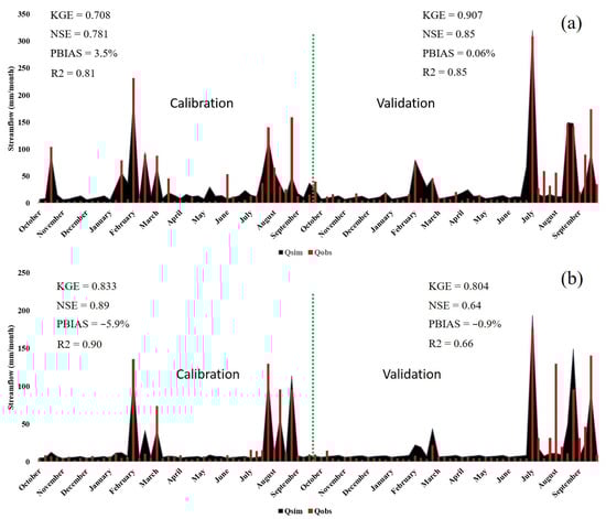 Monthly streamflow simulated during calibration (2002–2006) and validation (2009–2013) periods for (a) the Chirah sub catchment and (b) the Dhoke Pathan sub catchment.