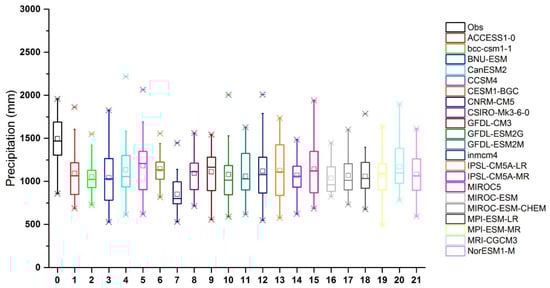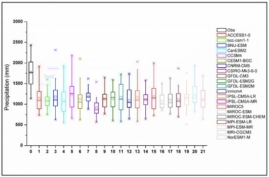 The box plots in Figure 3 show the distribution of historic annual precipitation (in black) over Chirah sub catchment for 1980–2004, together with the corresponding estimations provided by the 21 NEX-GDDP models (in colors). Considerable variability is depicted by almost all the NEX-GDDP GCMs in simulating average annual precipitation.