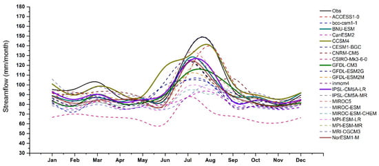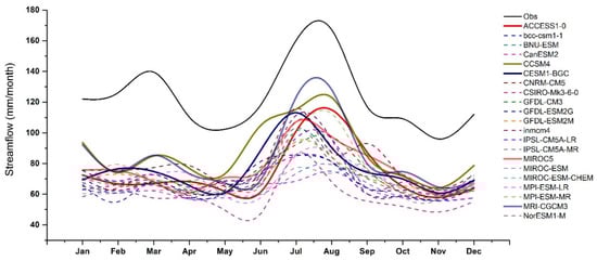 On the basis of these results, only those models which satisfied the criteria mentioned in Section 2.6 were selected to form the final multi-model ensemble: ACCESS1-0, CCSM4, CESM1-BGC, MIROC5 and MRI-CGCM3 (BNU-ESM, CCSM4, GFDL-CM3. IPSL-CM5A-LR and NorESM1-M) for the Chirah (Dhoke Pathan) sub catchment. Note that all these models characterized well the interannual variability of the historic streamflow (Figure S1 in the “Supplementary Materials” section).