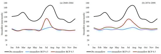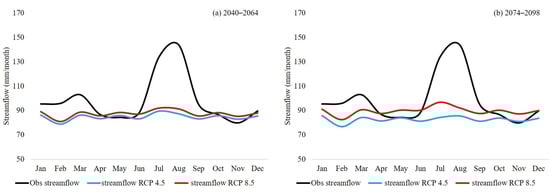Average monthly streamflow, as projected using the 5 best performing NEX-GDDP models under the RCP 4.5 and 8.5 (blue and red lines, respectively) to force the HBV-light model over Chirah sub catchment for (a) 2040–2064 and (b) 2074–2098. For comparison purposes, the corresponding historical values are also given in black.