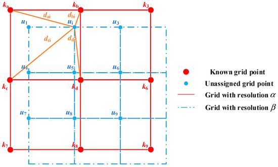 As shown in Figure 2, suppose the resolution of the known grid point dataset is , and the resolution of the unassigned grid point dataset is , where . Let be the i-th unassigned grid point in , and the latitude and longitude of are expressed as in tuple. , , , are known grid points in , and the horizontal grid enclosed by , , , is the smallest horizontal grid enclosed by . , , , is the grid point value in , and its longitude and latitude are represented as , , , . The distance , , , between and , , , can be calculated by Euclidean distance as follows: