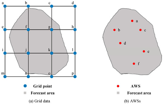 Schematic diagram of the forecast area including (a) grid points and (b) AWSs.