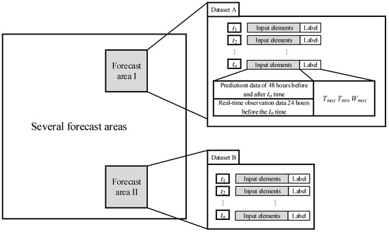 Take the prediction of the highest ground temperature of 2 m (), the lowest temperature of 2 m (), and the highest wind speed of 10 m () in the next 24 h in a region as an example. As shown in Figure 4, each forecast area corresponds to a set of datasets. For example, forecast area I corresponds to dataset A, and forecast area II corresponds to dataset B. All datasets are divided by moment corresponding to n groups of data, and each group of data is composed of input elements and labels. Take the data at (UT: 00:00:00) as an example. The data of 48 h before and after the forecast product and 24 h before the real-time observation and detection data at are obtained. The data are extracted according to the factor subset elements to form the input dataset at the moment . Then, , and of the next 24 h at the moment are used as labels. Random forest is used to train the dataset and establish statistical mode. This model is denoted as model I, which outputs the predicted value of , , and for a certain area in the next 24 h.
