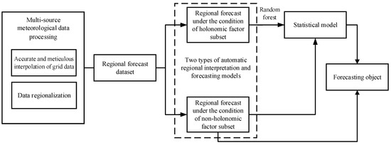 For different forecast areas, regional forecasts under the holonomic factor subset conditions and regional forecasts under the non-holonomic factor subset based on similar forecasts are designed. The ML-MOS model uses random forest as the core algorithm to generate statistical models, establishes the relationship between input elements and output elements in the dataset, and realizes automatic interpretation and forecasting of designated areas. The ML-MOS model framework is shown in Figure 5.