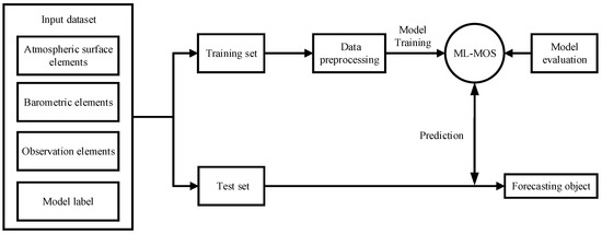 This section mainly describes the specific implementation of the ML-MOS model. Firstly, we propose a multi-source meteorological data processing method to ensure the efficient utilization and organization of multi-source meteorological data. Secondly, the process of improving the self-learning and generalization capabilities of the traditional MOS model based on the random forest algorithm is described. We propose an ML-MOS model to adapt to the automatic interpretation and forecasting of different regions. Finally, we outline the framework of the ML-MOS model.