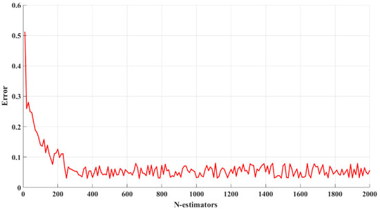 During the experiment, the number of features output by the random forest was analyzed by the traditional MOS model, and Max_ feature could be determined. Max_ depth usually ranges from 10 to 100, and Max_ depth = 50 was used in this experiment. During the experiment, the dataset was randomly divided 200 times by adjusting N_ estimators, and the RMSE of the test set was observed to change with M_ estimators, as shown in Figure 7. It can be concluded from Figure 7 that when the value is 300, the RMSE value begins to decrease slowly. When the value of N_ estimators is 800, the error remains basically unchanged.
