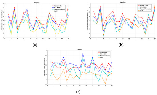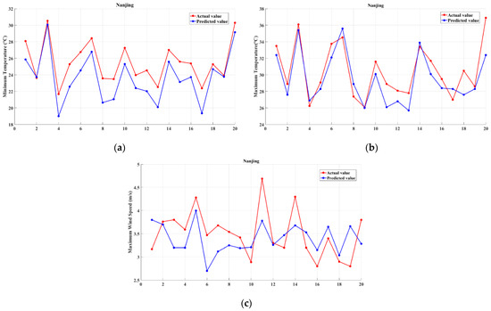 Comparison of actual and predicted values of Nanjing area (a) Tmax, (b) Tmin and (c) Wmax.