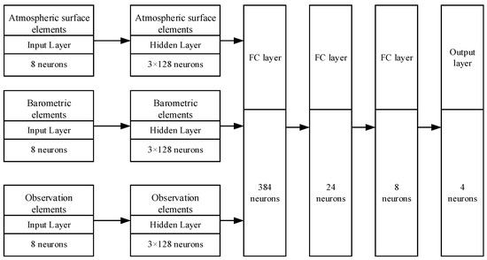 We used a six-layer neural network, containing three input layers, one output layer, three hidden layers, and three FC layers. The number of neurons in each of the three hidden layers was the same. In the training process, the number of neurons was set to 16, 32, 64, 128, and 256, respectively, and the ReLU loss function was used. The training results show that the convergence state can be reached after about 12,000 iterations, and the network parameters and convergence effect can reach the optimal state when the number of neurons is set to 128. Eight, six, and six inputs were used for the three input layers, corresponding to Atmospheric surface elements, Barometric elements and Observation elements. The number of neurons in the fully connected layer is 384, 24 and 8 respectively. The output layer includes three outputs, i.e., , , . The network structure is shown in the Figure 9.