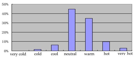 For indoor air quality, the main detection items were the concentrations of formaldehyde, TVOC, benzene, toluene, and xylene, while the other detection items were indoor temperature, background noise; the thermal, acoustic, and light environments; subjective satisfaction etc. The main IAQ instruments used in this experiment were an atmospheric sampler (SQC-1000), an ultraviolet spectrophotometer (Genesys II), a gas chromatography-mass spectrometer (Trace DSQ), and an environmental radon meter (FD216). Acoustic and lighting monitors were used for the noise and lighting indexes, and a data logger, sensors for humidity, air temperature, and airspeed at heights of 0.1 m, 0.6 m and 1.1 m to comply with ASHRAE 55-2017 were used in conjunction with an occupant questionnaire to evaluate the acceptability of the indoor thermal environment [42]. The results of the questionnaire results are listed in Figure 1. According to the test results analysis (see Figure 1), the thermal-neutral temperature in the Shanghai area under natural ventilation should be between 27.8 °C and 28.1 °C. The results are very reasonable since electric fans are primarily used from June to October, while air conditioners are mostly used from July to September in Shanghai. Heating in winter is used mainly from December to January in Shanghai.