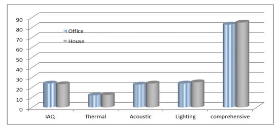 The case study results show how to use the proposed AHP decision-making system for the analysis data collected in Table 4. Using Equation (6), the final results of this case study are demonstrated in Figure 2. The method described above can be carried out to evaluate the indoor environment of different types of eco-buildings. An assessment structure needs to consist of the scores derived from all the rooms in the building for an office building. The weighting means method was used to organize the scores of the rooms. At first, the assessment was of a single room and then it was included in the integrated assessment of the whole building. The building rooms were sorted into meeting rooms, general offices, open-plan offices, and designing and drawing rooms, after evaluation. Rooms with the same purpose were evaluated together. Finally, the score values were the weighted means of all the rooms. The weighting was based on the area of the room. In conclusion, the building was evaluated by the scores of all the purpose rooms. The weighting was also based on the total area of the rooms with the same purpose.
