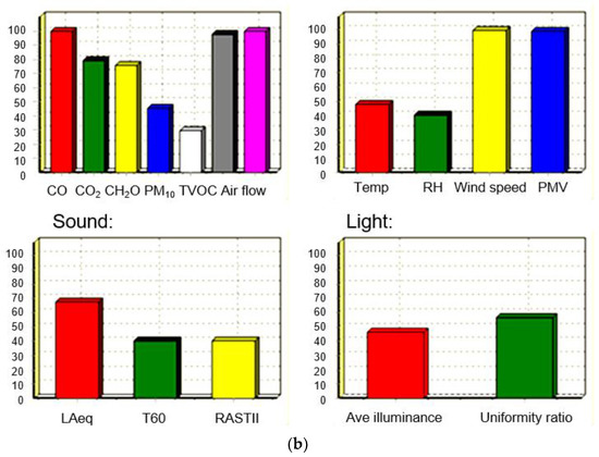 The indoor environmental assessment, the main component of the software, includes three main parts: detection, evaluation, and improvement (Figure 3b). The evaluation part includes testing, which involves elements of standards, instruments, personnel, testing systems, and other aspects of the input elements. The evaluation part includes time, place, and the corresponding assessment model. The improvement part includes the eco-building itself. Finally, the data in Table 4 were calculated in the model, and the evaluation conclusion was obtained (Figure 3b). In Figure 3b, measurements of indoor environmental variables, such as indoor air quality pollutants, air temperature, relative humidity, air velocity, luminance, and a-weighted sound pressure level, are listed.