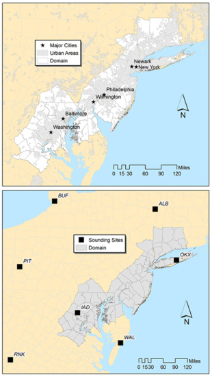 (top) The domain of study, major cities, and regional urban footprint. (bottom) NOAA-operated atmospheric sounding sites over the Mid-Atlantic region in the United States.
