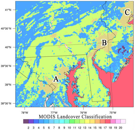 Moderate resolution imaging spectroradiometer (MODIS) land cover classifications over the domain (shown via WRF output variable LU_INDEX). Yellow, cross-hatched areas highlight urban land surface type (MODIS land cover classification No. 13). The labels correspond to each respective urban cluster—DCBAL (A), PHLWIL (B), and NYC (C). Combinations of these clusters are represented in the form A + B or DCPHL. (See Appendix A for descriptions of all MODIS land cover classifications.)