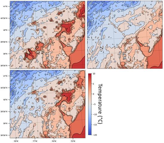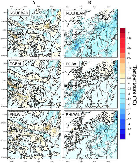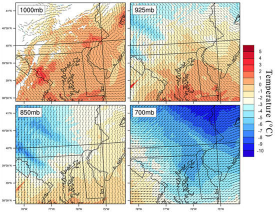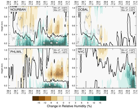 Another perspective on this departure can be seen via vertical cross-sections, as depicted in Figure 11, of temperature and relative humidity (Figure 12 and Figure 13). This transect originates in Northern Virginia just southwest of Washington, DC (38.9° N), travels northeast through Baltimore, MD (39.2° N) and Philadelphia, PA (40.0° N), and ends at Princeton, NJ. While only one time slot near 0800 UTC is shown, all hourly steps were generated. A warmer layer of air, T > 0 °C, entered the domain from the southwest, centered near 2 km above the surface, and overran the colder air at the surface. By 0800 UTC, the warm layer or trowel had traveled approximately two-thirds of the cross-section length and had deepened to just under 2 km thick in the control simulation. At the surface (Figure 14), temperatures above freezing were present coincidently with Washington, Baltimore, and Philadelphia; these represent each city’s BLUHI. The warmer surface temperatures were no longer present in the NOURBAN simulation and were reduced in the remaining two runs over the “reforested” cities by 2–3 °C. Figure 15 displays the differences in air temperature and relative humidity from the control simulation. Interestingly, Figure 15 shows the magnitude of the DC-Baltimore BLUHI in the poleward direction was slightly reduced even when its urban surface remained in the land cover scheme but PHLWIL was removed. This result implies that at least some component of the DC-Baltimore UHI is related to the existence of Philadelphia and Wilmington even though the two urban clusters were not directly adjacent to one another.
