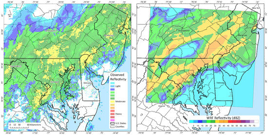 The precipitation timing occurred in two distinct waves or modes. The first was brief and entered the domain around 0000 UTC on 6 February (not shown) and the second, more significant period approached the urban corridor around 1800 UTC on 6 February. Figure 5 shows a comparison of observed precipitation from the NOAA radar sites and the derived reflectivity from the control simulation. The timing and spatial coverage of precipitation is presented well. There are some issues with modeled areal coverage of the highest precipitation rates compared to observations, but the upper limit of precipitation intensity is captured well. It is useful to note that model simulations rarely produce every detail of the quantitative precipitation field. Since precipitation is heterogeneous, unlike more slowly evolving fields like temperature and wind, the simulations depend heavily on model-specific factors (i.e., microphysics, resolution, domain selection, initial conditions, etc.). A review of modeled surface temperatures is also consistent with station-based observations. Considering the temperature-sensitive nature of the BLUHI and the appropriate simulation of precipitation timing, these two factors are deemed to be sufficient. Figure 5 shows a comparison of the observed Doppler composite over the domain and the simulated reflectivity at 1800 UTC on 6 February 2004.