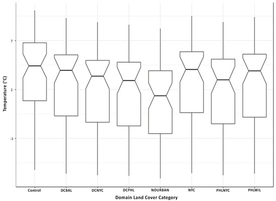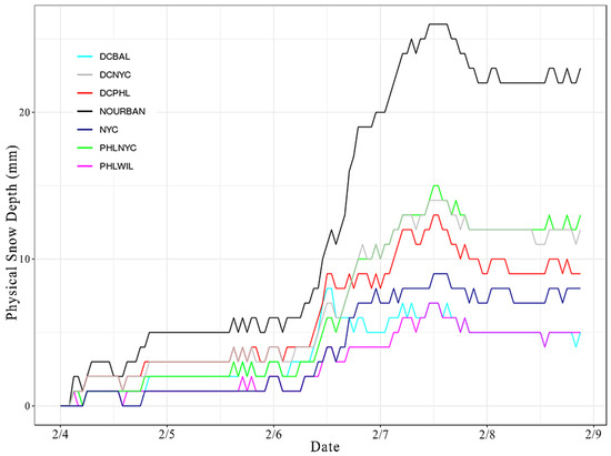 When looking across all times, Mann–Whitney U test values of p < 0.10 for DCBAL, PHLWIL, and NYC and p < 0.05 for NOURBAN, DCNYC, DCPHL, and PHLNYC denote significant differences in T2m from the control field at 90% and 95% confidence, respectively. Departures in T2m expand in the precipitation subset where all configurations differed with 95% confidence except NYC (90% confidence). These statistics hold firm in Figure 6, which provides a graphical interpretation of each land cover T2m distribution in the onset subset. Beyond surface temperature, other factors directly related to impact include the frozen fraction of precipitation and snow depth.