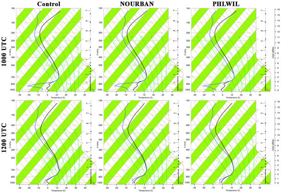 WRF-simulated vertical atmospheric soundings at Philadelphia, PA over the control, NOURBAN, and PHLWIL simulations. Valid at 1000 and 1200 UTC on 6 February 2004. Black and blue lines are temperature and dewpoint (°C), respectively.