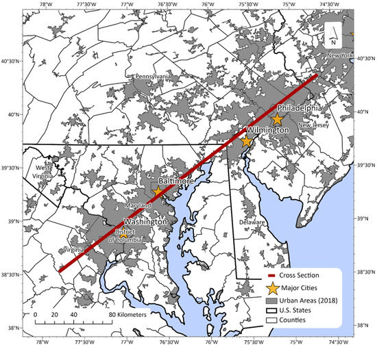 Graphical depiction of the horizontal path for the WRF-simulated vertical cross-section (red line). Urban footprint (grey) and major cities (stars) are also shown.