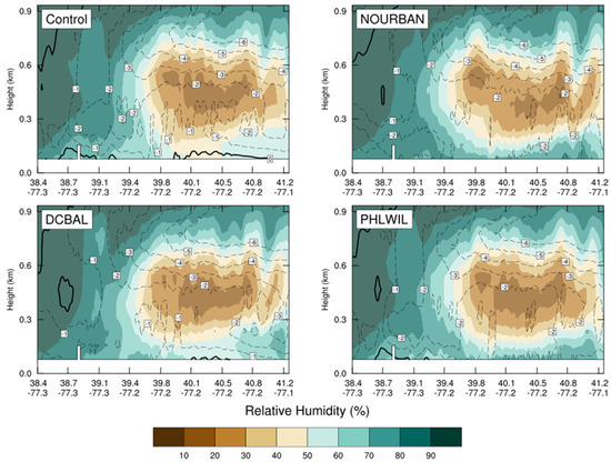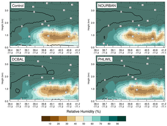 These relationships are also reflected in the available moisture at the surface. At the time step shown in Figure 13 and Figure 14, precipitation is beginning in the southernmost (or left) part of the cross-section where high relative humidities are observed throughout the column. A very dry layer of air is present in the northern half of the domain near the surface in the control. Layers of lower humidity are often responsible for evaporation and sublimation of light stratiform precipitation that falls from saturated layers above. Evaporation is a cooling process due to the significant latent heat transfer from the surrounding atmosphere to facilitate the phase change. This dry layer slowly progressed northeast over time in front of the trowel. While the magnitude of the dry layer remained consistent, the surface was markedly less dry in the NOURBAN run and other runs following the previously described temperature pattern. The relative humidity at the surface around the urbanized DC-Baltimore area was higher when PHLWIL was replaced, resulting in a shallower dry layer. The water vapor mixing ratio (not pictured) was also incrementally higher in the same scenario. Once again, this suggests a regional response to urbanization existed beyond the local urban–rural interface. The implications for this process on precipitation type are complicated as a thinner dry layer could actually lead to more observed surface precipitation due to less evaporation while simultaneously decreasing the cooling from the same process near the surface. There was also a curious fall in relative humidity above approximately 500 m over reforested areas that coincided with increases in humidities near the surface. Future research might focus on the physical causes for these humidity dipoles in model simulations, the implications of near surface relative humidity, the magnitude of the urban dry island, and the response of precipitation in various scenarios.