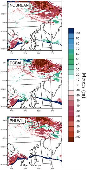 WRF-ARW simulations on a fine spatial scale such as a 1.1-km horizontal grid provide a unique perspective on urbanization and the atmospheric response. Few studies have attempted to create these simulations to monitor these responses outside of warm-season convection and even fewer, if any, focus strictly on winter precipitation. The results presented in the paper show that a variety of features may be studied but also highlight the limitations of current numerical capabilities. For example, Figure 15 shows the departure of LCL height in modified land cover simulations from the control, MODIS land cover simulation. While the results were negligible outside of the northern and southwestern regions where cloud bases were lower than the control run and artificial pseudo-linear stretches of higher LCLs are seen across all three figures. This may be due to surface-based convective rolls present in conditionally unstable WRF simulations and described by Bryan et al. [40]. If these are indeed represented as such, this scenario should not exist in these simulations considering the lack of instability during the synoptic setup and, more generally, due to seasonality. Despite this abnormality, there were a few areas that provide insight into urbanization and evolution of winter precipitation.