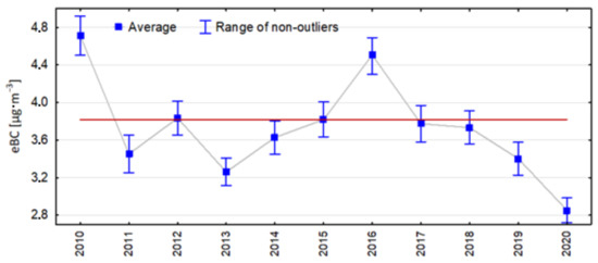The chart of mean and non-outlier eBC concentrations at the urban background station in Zabrze (2010–2020 period).