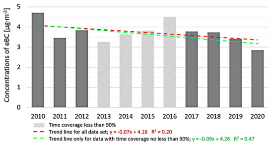Descriptive statistics of eBC concentrations in the entire 11-year measurement period and in individual years are summarized in Table 1. Taking into account the entire research period, the obtained time coverage was 90%, which confirms the correctness of the long-term average calculations. On the other hand, it was found that the condition of the required time coverage for the annual averaged period (not less than 90%) was not met in 2013–2016. Thus, data from this period will not be taken into account when discussing in detail the average annual concentrations of eBC. In addition, data from 2009 were also eliminated from further consideration as the measurements did not cover the entire calendar year.