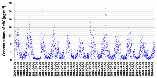 The concentrations of eBC recorded by the MAAP are given with a resolution of 10 min. Taking into account the entire measurement period (October 2009–December 2020), the total number of 10-min eBC measurements was 557,858, resulting in a time coverage of 94%. On the basis of the raw eBC dataset, the mean one-hour concentrations were calculated, from which the mean daily, monthly, seasonal, and annual concentrations were then determined.
