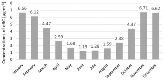 Figure 5 and Figure 6 represent monthly and seasonal fluctuations in the concentration of eBC, averaged over the years 2009–2020. Taking into account the average monthly concentrations of eBC (Figure 3), a general constant decrease in concentrations was observed from January (BCave = 6.66 µg·m−3) until reaching the minimum in June (BCave = 1.19 µg·m−3). After this period, eBC concentrations begin to increase and reach their maximum value in November (BCave = 7 µg·m−3). Despite some slight differences in individual years, Figure 3 clearly shows that in the winter months (December, January, February) the eBC concentration was much higher (BCave = 5.90 µg·m−3) than in the summer months (BCave = 1.87µg·m−3). A comparison of long-term eBC concentrations with the values from the 13-year period (1989–2002) in the area of the Canadian Arctic shows a similar relationship; however, the peak concentrations of eBC were observed in the period from January to April [58]. Considering only measurement stations with similar characteristics, the average monthly eBC concentrations recorded at the urban station in Varanasi (Indo-Gangetic Plain, South Asia) (from ~5 to ~24 µg·m−3) were higher than those registered in Zabrze, but revealed similar variations, with a maximum falling in January [41]. High concentrations of eBC in the fall and winter months were also observed during long-term measurements carried out at urban background and industrial in Germany [46]. The exceptionally high mean monthly concentration of eBC observed in January was explained by the influence of unfavorable weather conditions (such as low air temperatures, lack of precipitation, low wind speeds, and frequent occurrence of the inversion layer), as well as general differences in emissions between winter and summer [46]. In turn, the maximum mean monthly concentration of eBC in February (BC) was recorded during the 3-year study conducted in Ostrava (Czech Republic), and this fact was explained by the influence of the burning of solid fuels for heating purposes in the area of investigation [47].