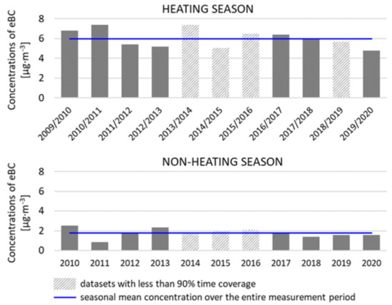 Seasonal course of eBC concentrations (µg·m−3) recorded for the heating and non-heating season.