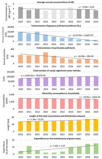 Average annual concentrations of eBC in Zabrze from 2010–2019, compared to the values of selected parameters collected in the Central Statistical Office database. The trend line is marked with a black dotted line. An incomplete filling in the eBC chart means that the required time coverage has not been achieved in a given year.