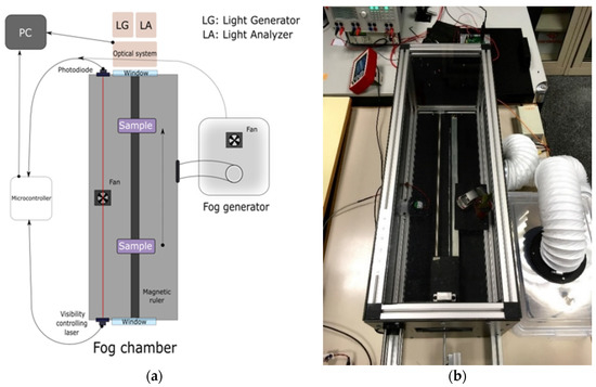 The experiment was carried out by developing and constructing a small-scale fog chamber enabled to reproduce, characterize, and control the levels of fog transmittance. The schematics are presented in Figure 1a and a photograph of the system in Figure 1b.