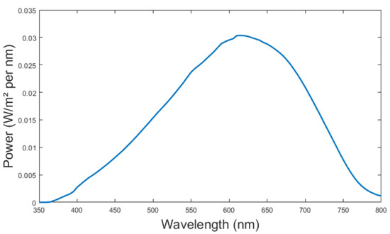 To perform the experiments, a white light source model SCHOTT KL 1500 ELECTRONIC was used with a linear polarizer properly aligned. The polarization state of light was calibrated with a polarimeter model PAX1000VIS/M from THORLABS. The light was almost perfectly linearly polarized at relative to the horizontal plane. The polarimetric characteristics of the light source (corresponding to the parameters defined in Equations (3)–(6) are presented in Table 2). The spectral characteristics of the light source are shown in Figure 3.