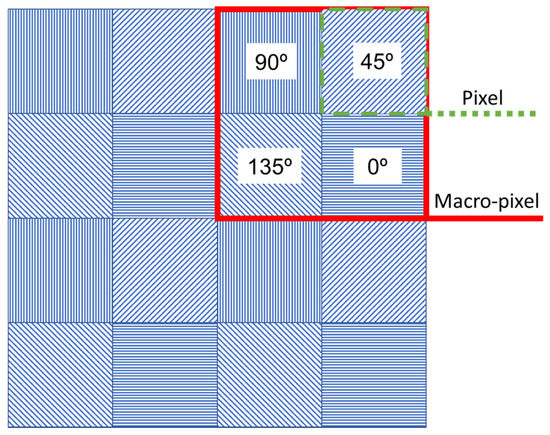 Scheme of the sensor of the polarimetric camera used as a detector. In front of each pixel, the corresponding polarizer is placed. The macro-pixel is the calculation unit.