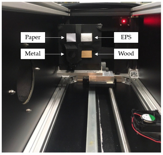 To hold the samples of the different materials of study, a test plate organized in the form of a 2 × 2 matrix was used. The samples were placed on the test plate as shown in Figure 5. Each of the squared samples had a size of 30 mm × 30 mm, and the diameter of the circular one was also 30 mm. The edge of the plate was covered with a black masking tape from THORLABS, and it was considered the background. The measured amount of visible light reflected from the tape was negligible (below 5%).