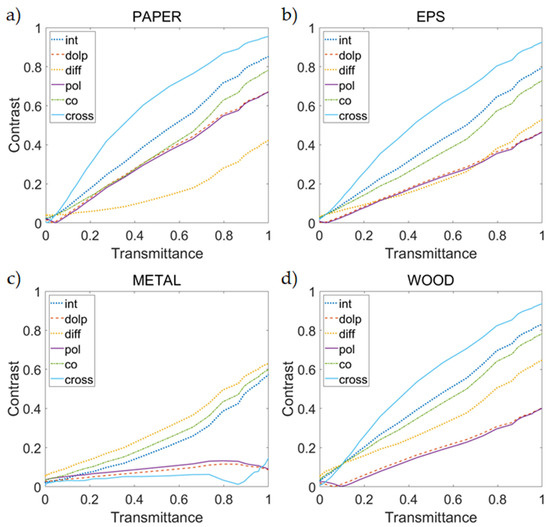 Figure 7 shows the evolution of the contrast between the selected sample and the background of the different image modes described in Table 4 for the four materials considered: (a) paper, (b) EPS, (c) metal, and (d) wood, measured at 45 different fog transmittance levels. The results obtained for the dielectric materials (paper, wood, and EPS) are comparable, while the metallic material behaves differently in coherence with what was observed in Table 3.