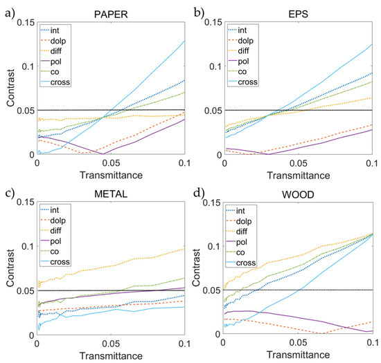 For very low transmittances (from T = 1 × 10−4 to T ~ 0.05), which correspond to very dense fog, the contrast for the intensity mode is, in general, below the visibility threshold (5%), as it can be seen in Figure 8. Therefore, all the samples will not be distinguishable when using the intensity image. At this range of transmittance, the DIFF polarimetric mode shows the highest contrasts. The DIFF mode, based on subtracting the cross-polarized component from the co-polarized one, is one of the most popular techniques for increasing contrast using polarization in biomedical microscopy [28]. This study shows that the same improvements presented through biological tissue can be obtained in very dense fog.